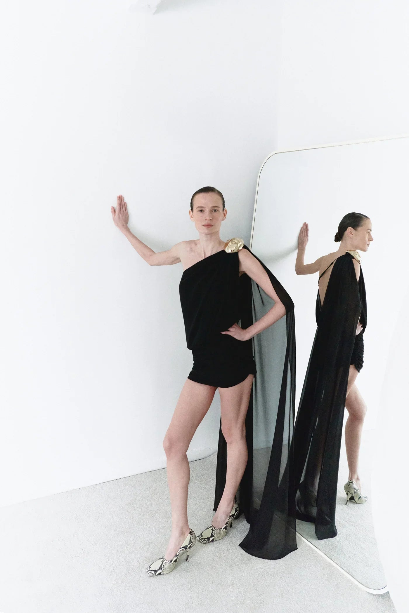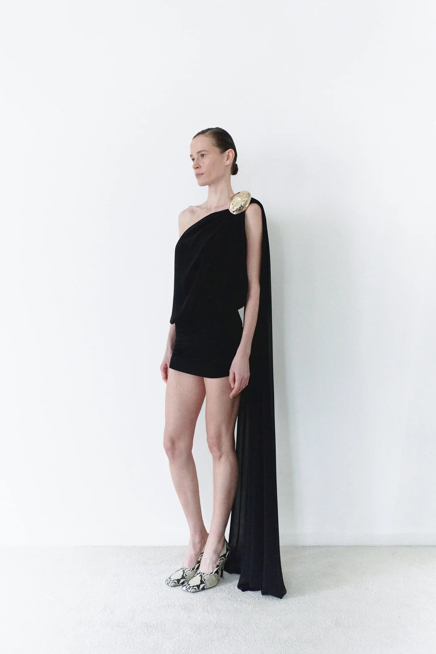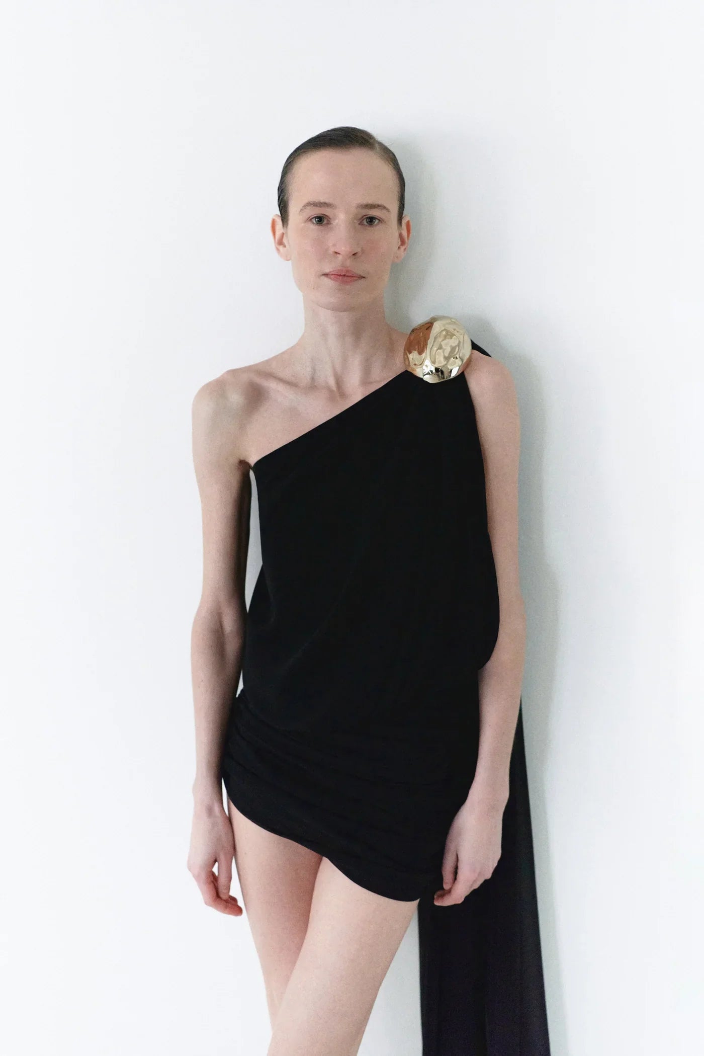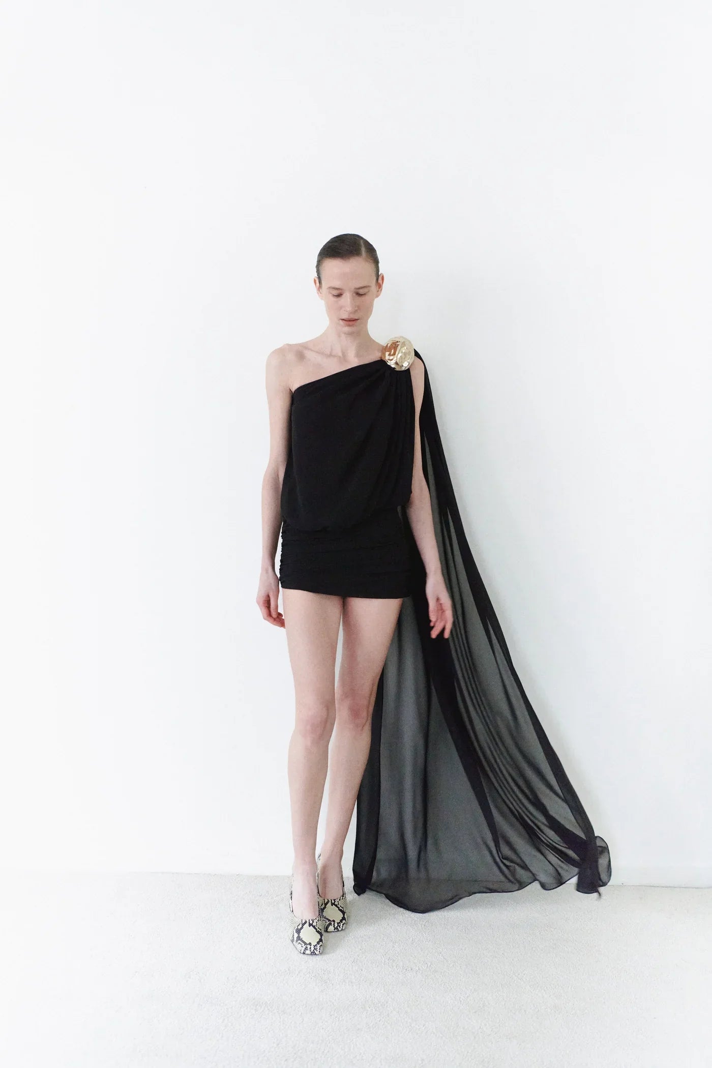 فستان شيفون بتفاصيل حجرية مصنوعة يدويًا باللون الأسود