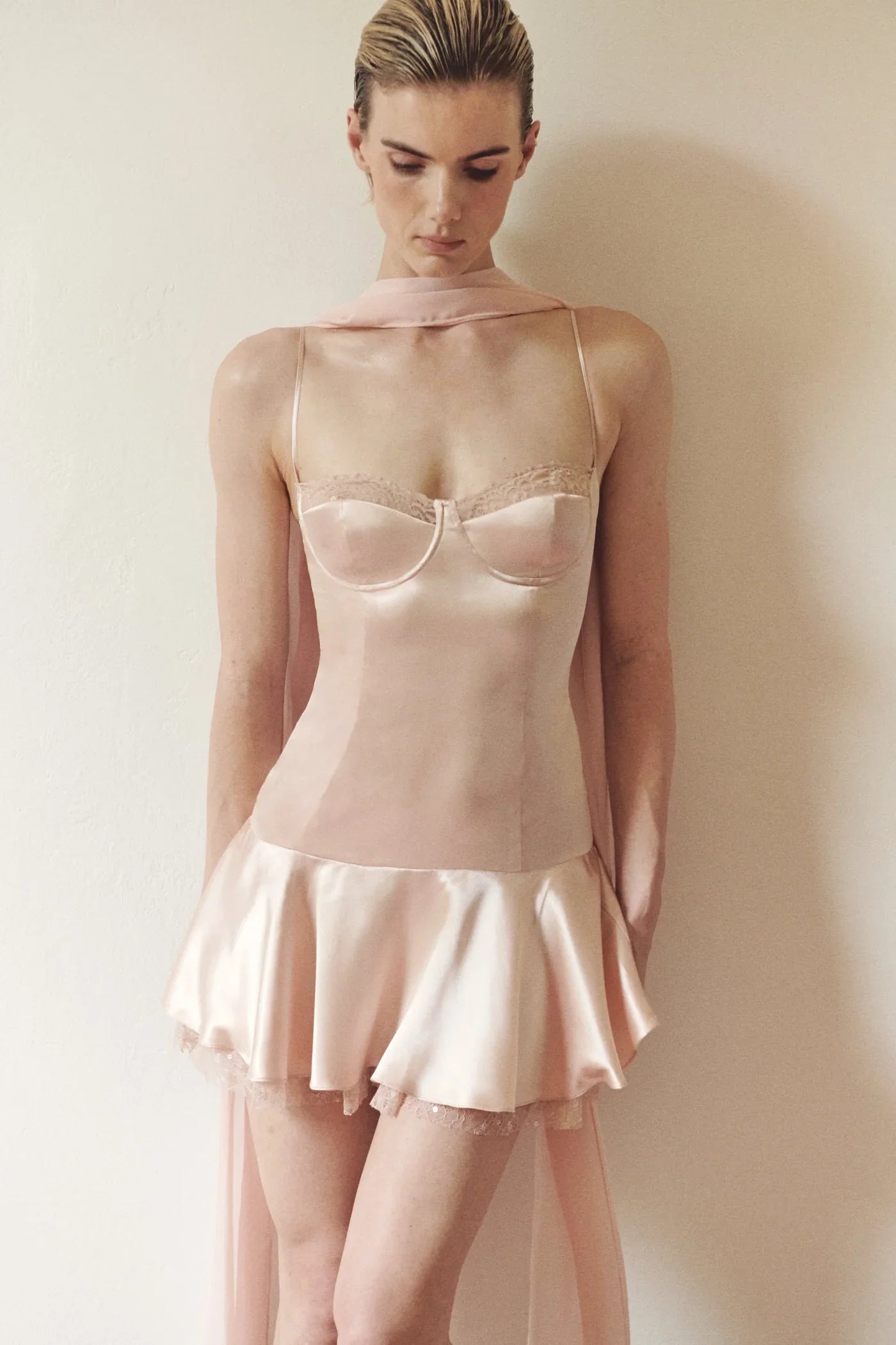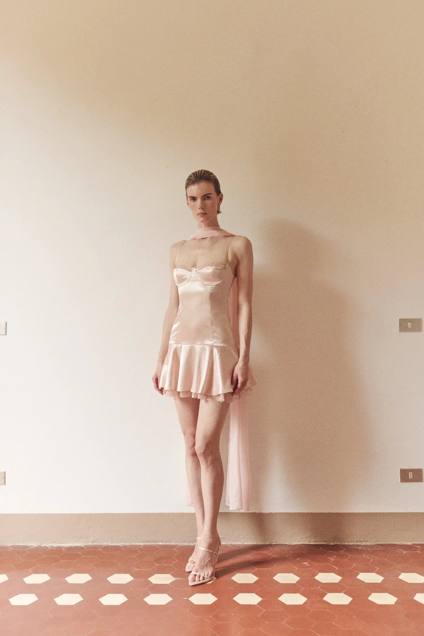 فستان قصير بتفاصيل دانتيل مع وشاح باللون السلموني