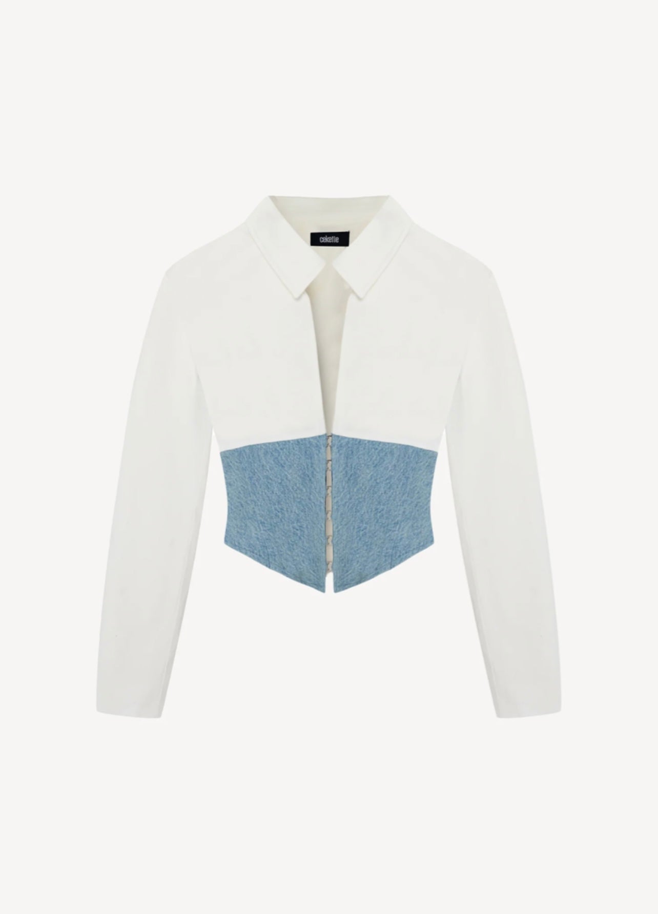 بليزر نينا من قماش الجبردين الفاتح مع قماش الدنيم باللونين الأبيض والأزرق السماوي