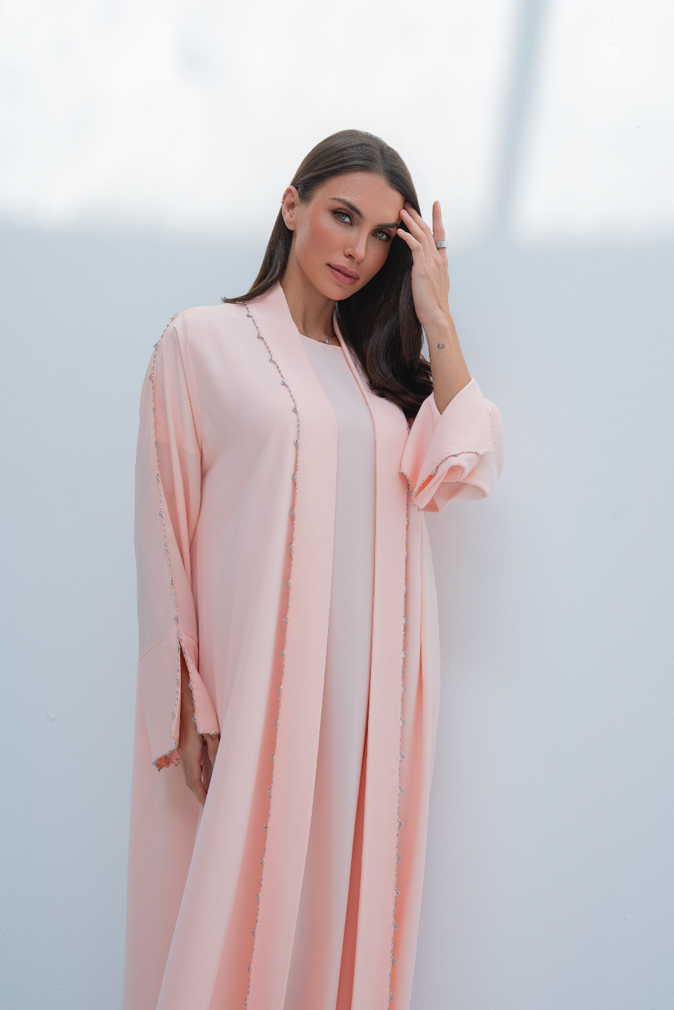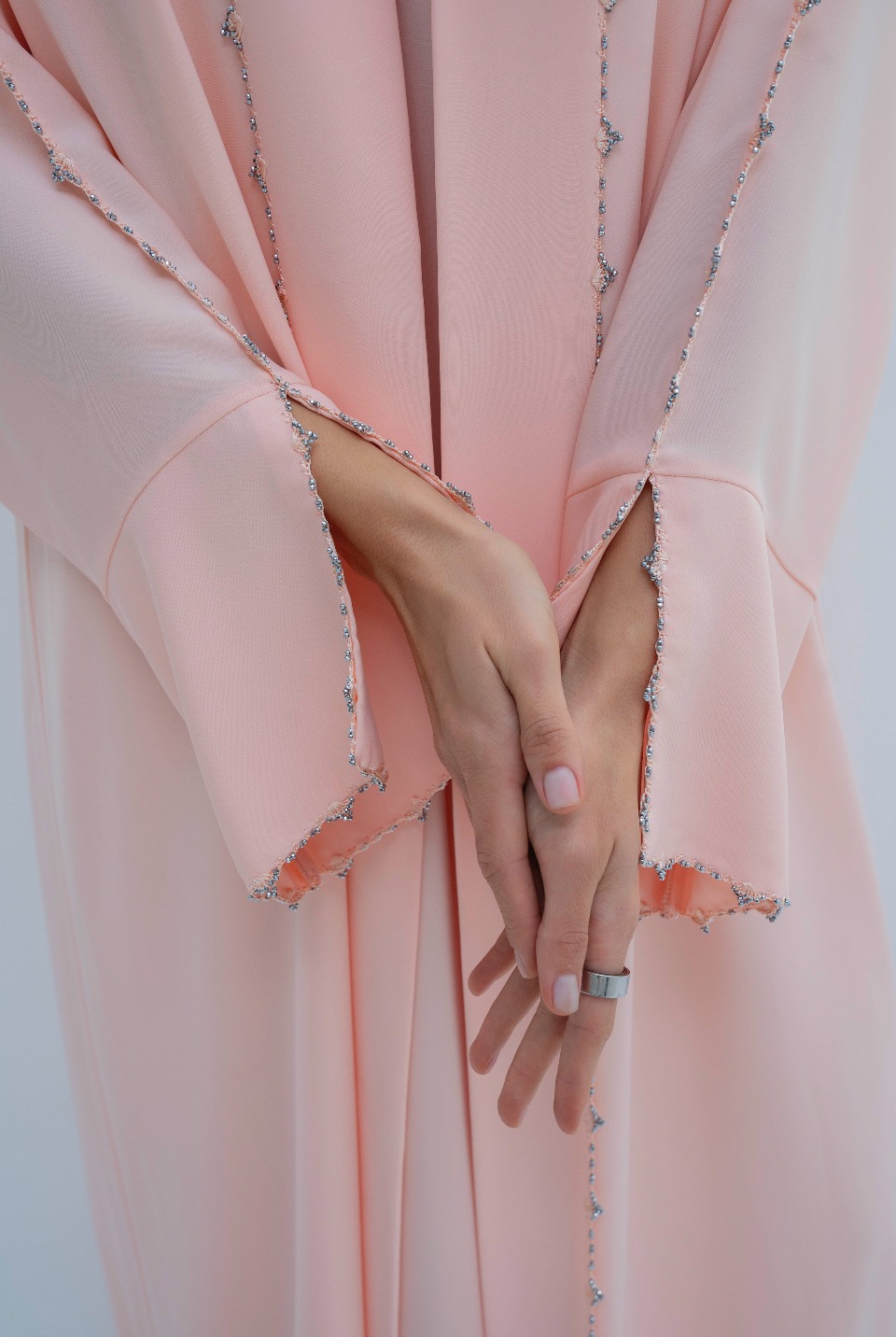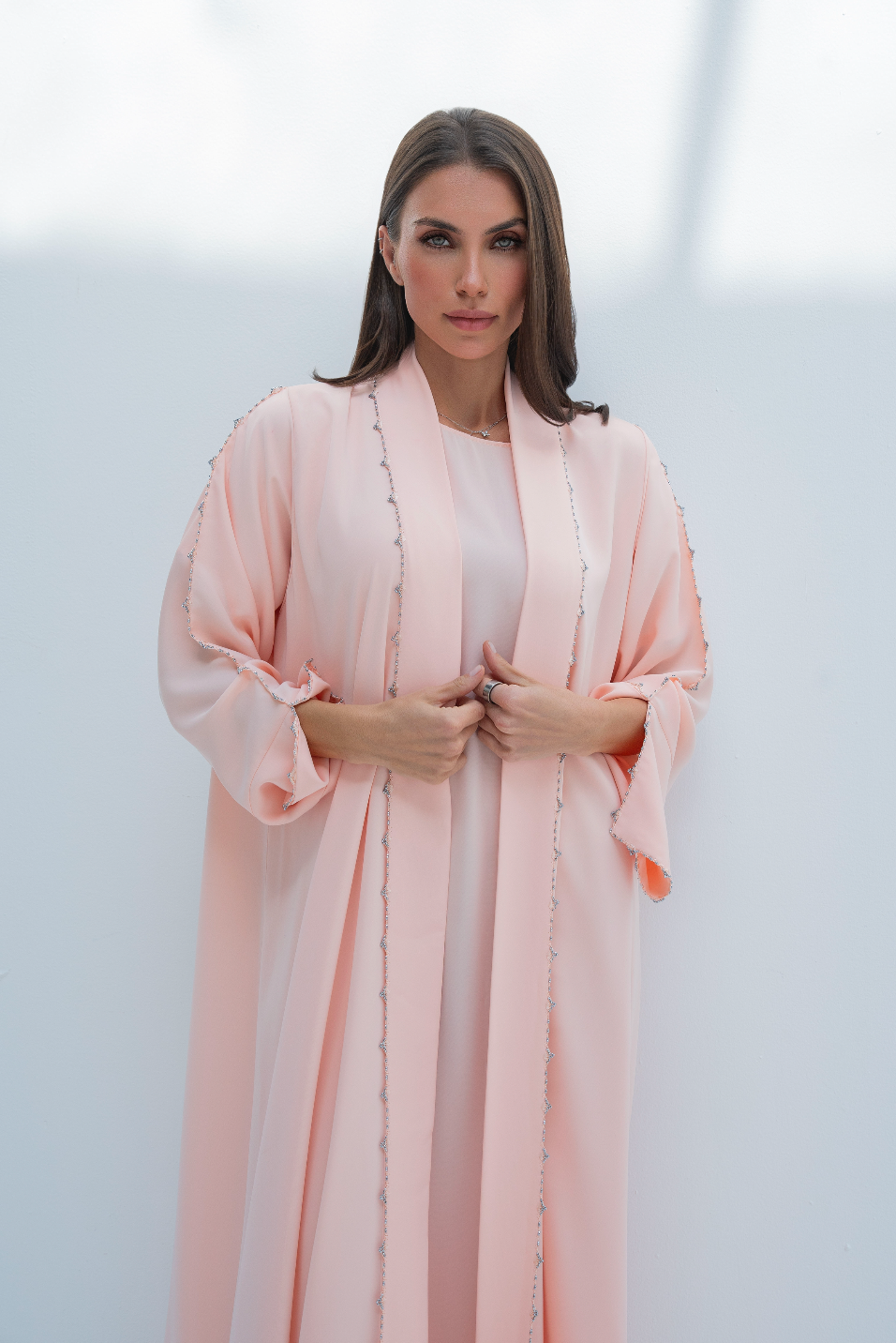 عباية مفتوحة من الأمام باللون الوردي مع كريستالات