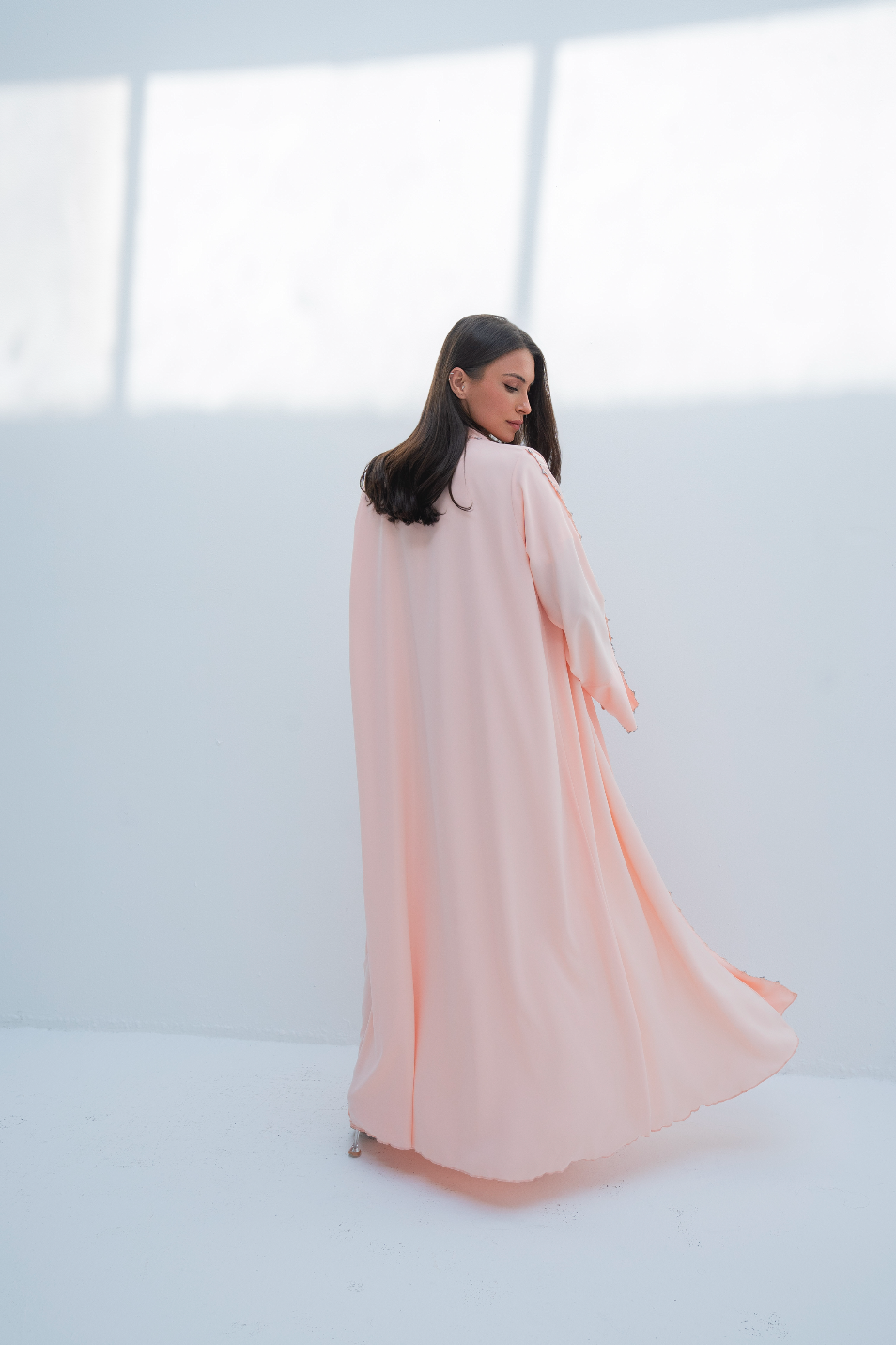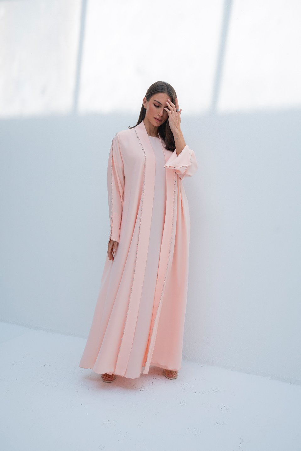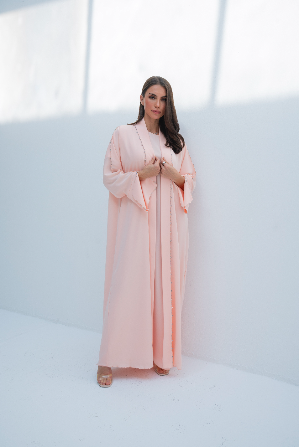 عباية مفتوحة من الأمام باللون الوردي مع كريستالات