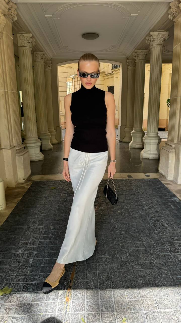 تنورة ساتان مع دانتيل باللون الكريمي