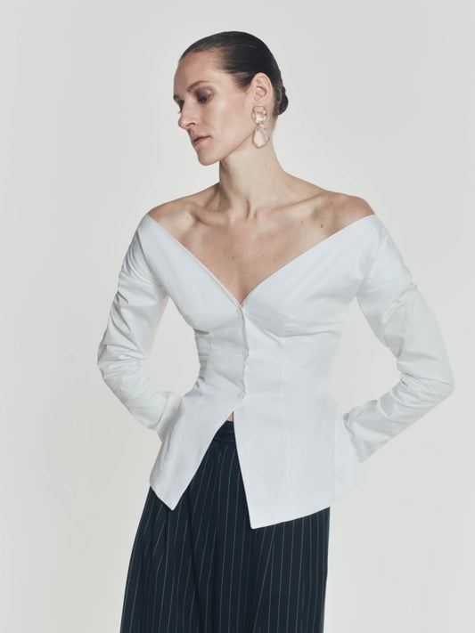 Pinstripe Off Shoulder Blazer in Navy Blue