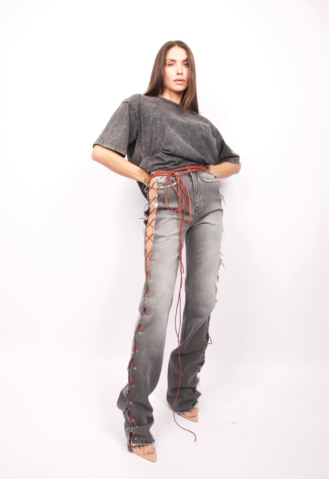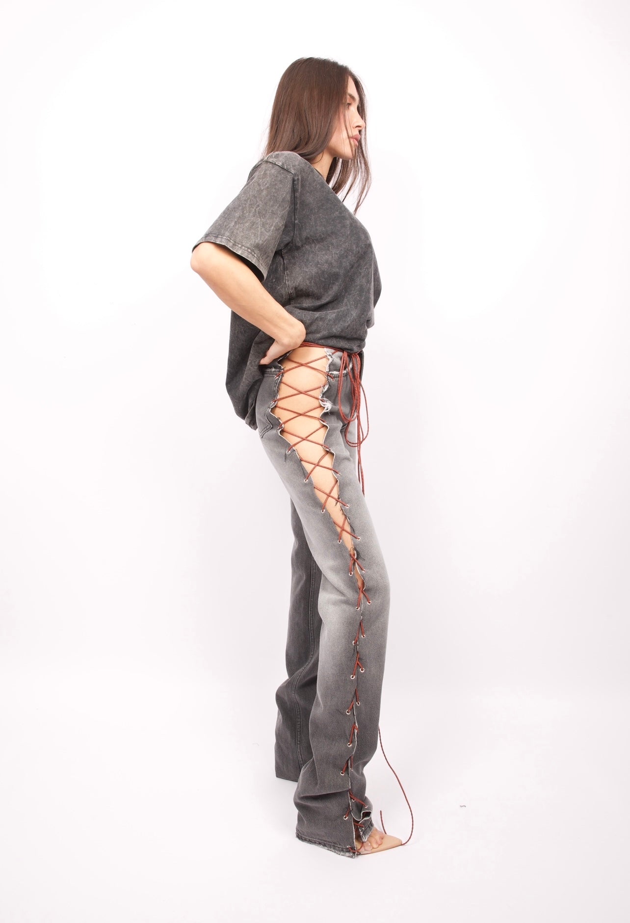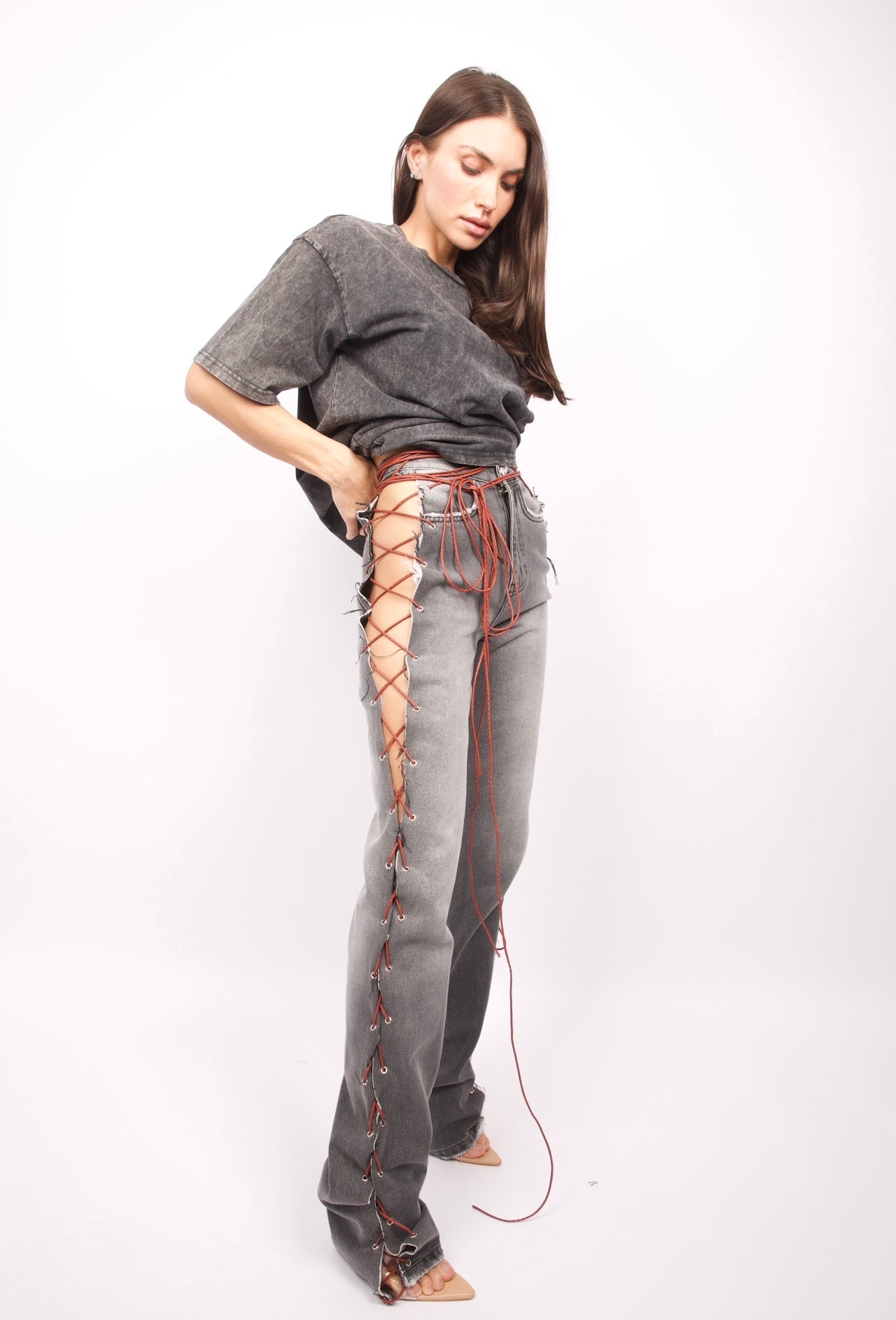 Jean gris à bretelles marron
